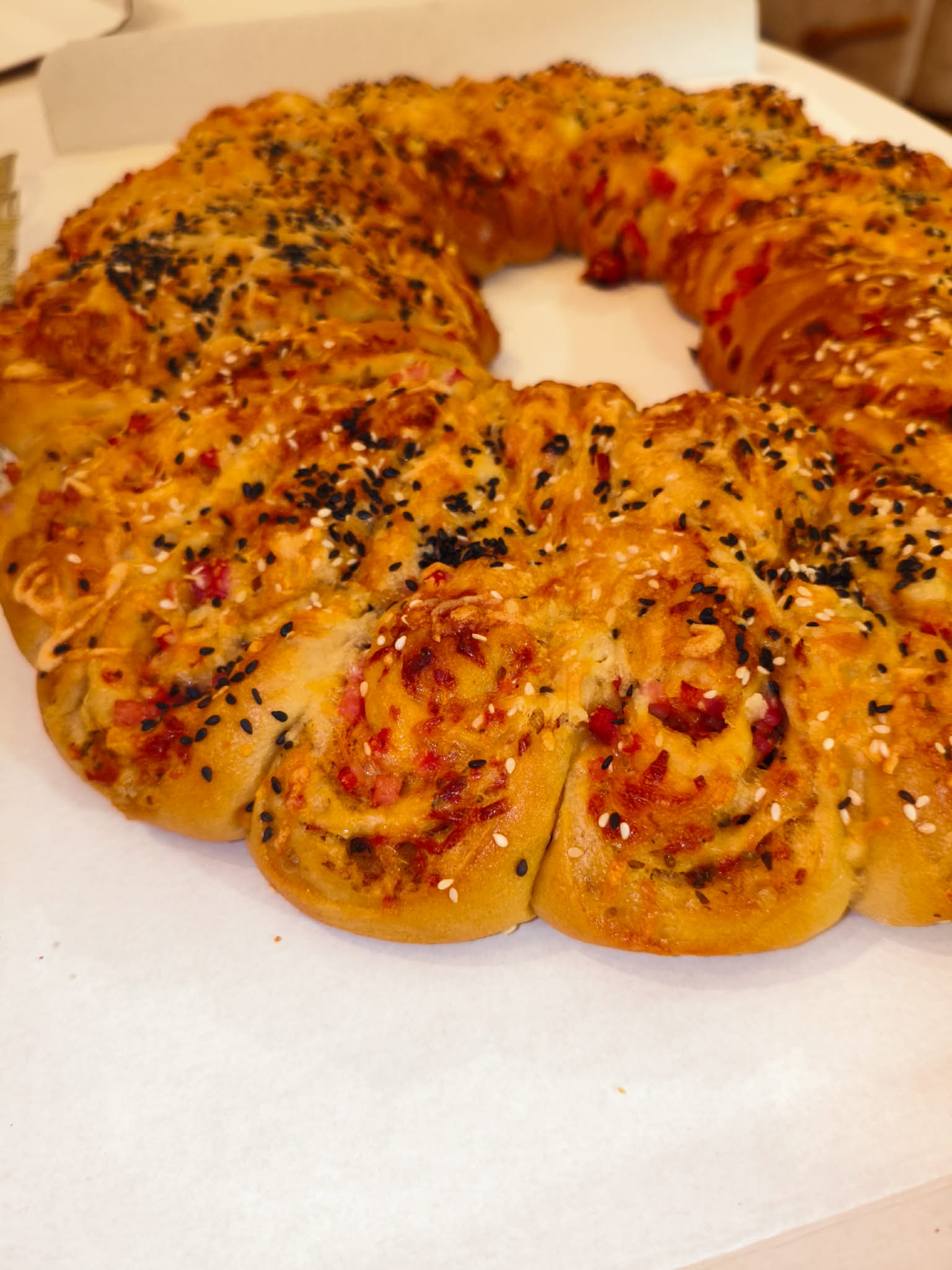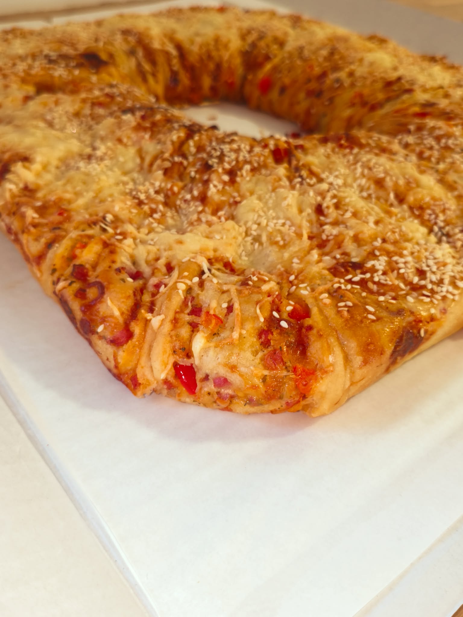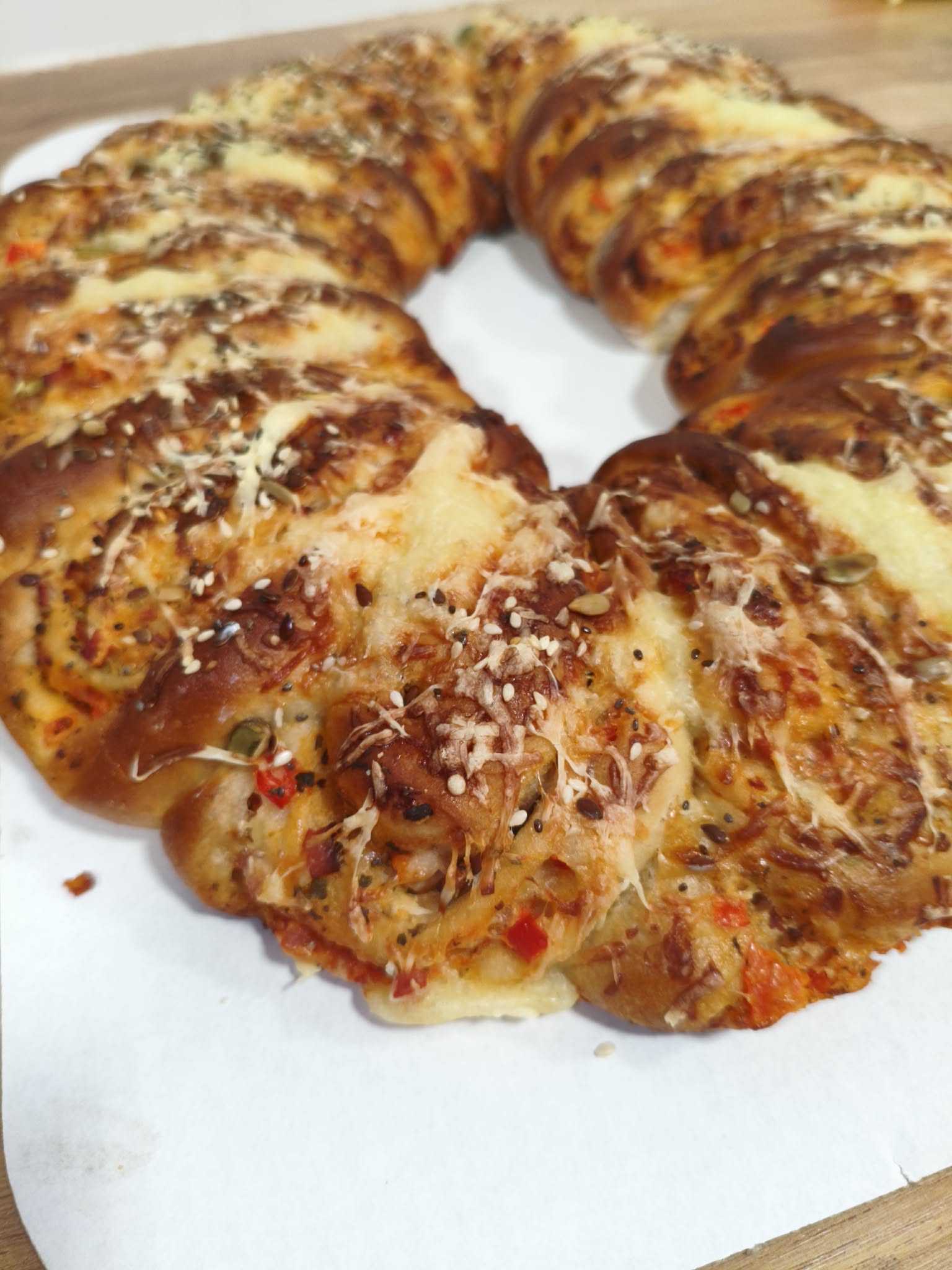 Koostis: Nisujahu, vesi, suitsusink, riivjuust, või 82%, sulajuust, paprika, tomatikaste, majonees, suhkur, muna, seesamiseemned, pärm, sool.