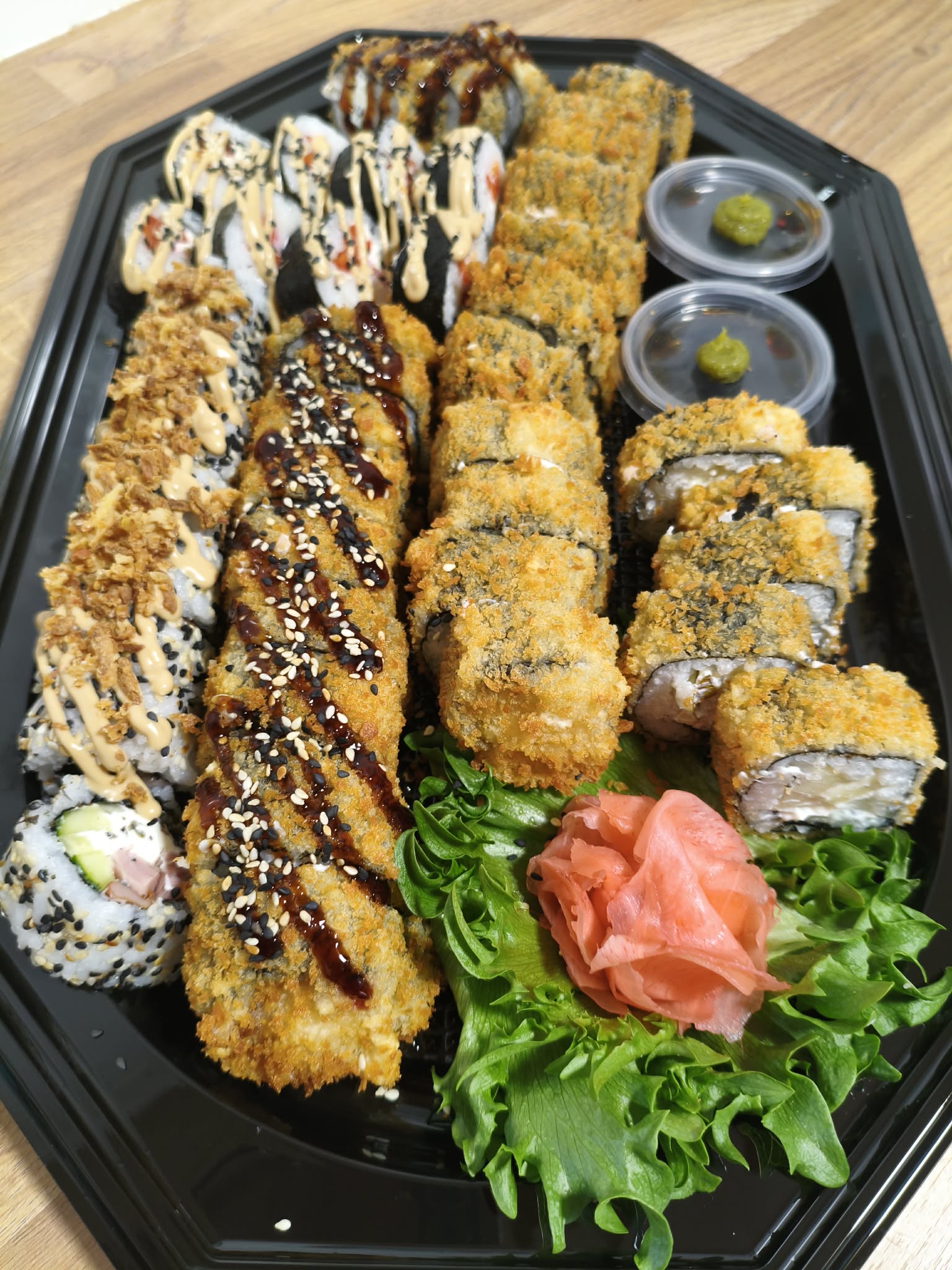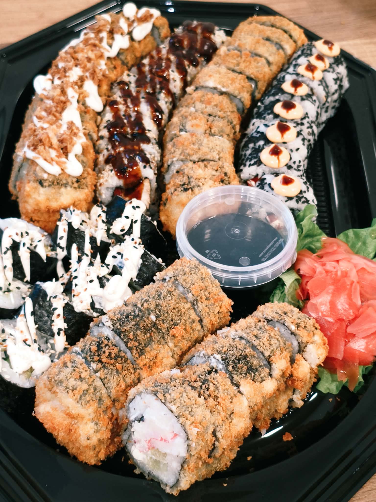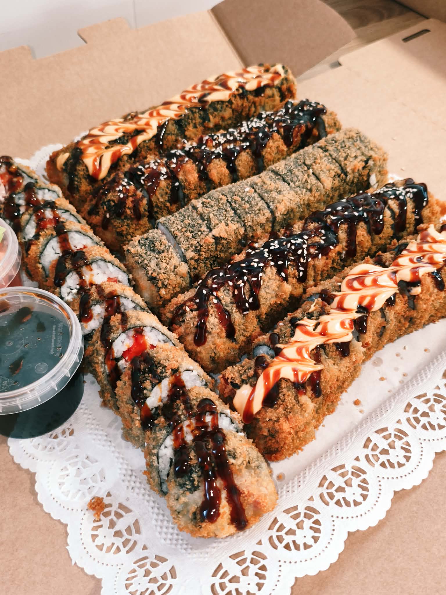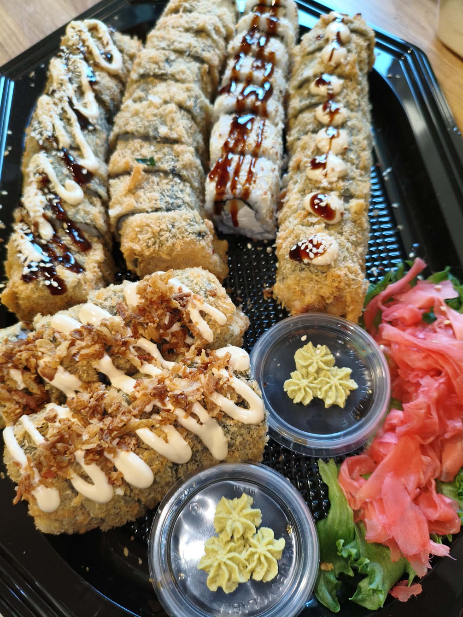 Koostis: Premium sushiriis, nori leht, täidis (kala/mereannid/kana), köögiviljad, toorjuust, tempura-jahu (nisu), panko riivsai, peale niristatud unagi-kaste või vürtsikas majonees.