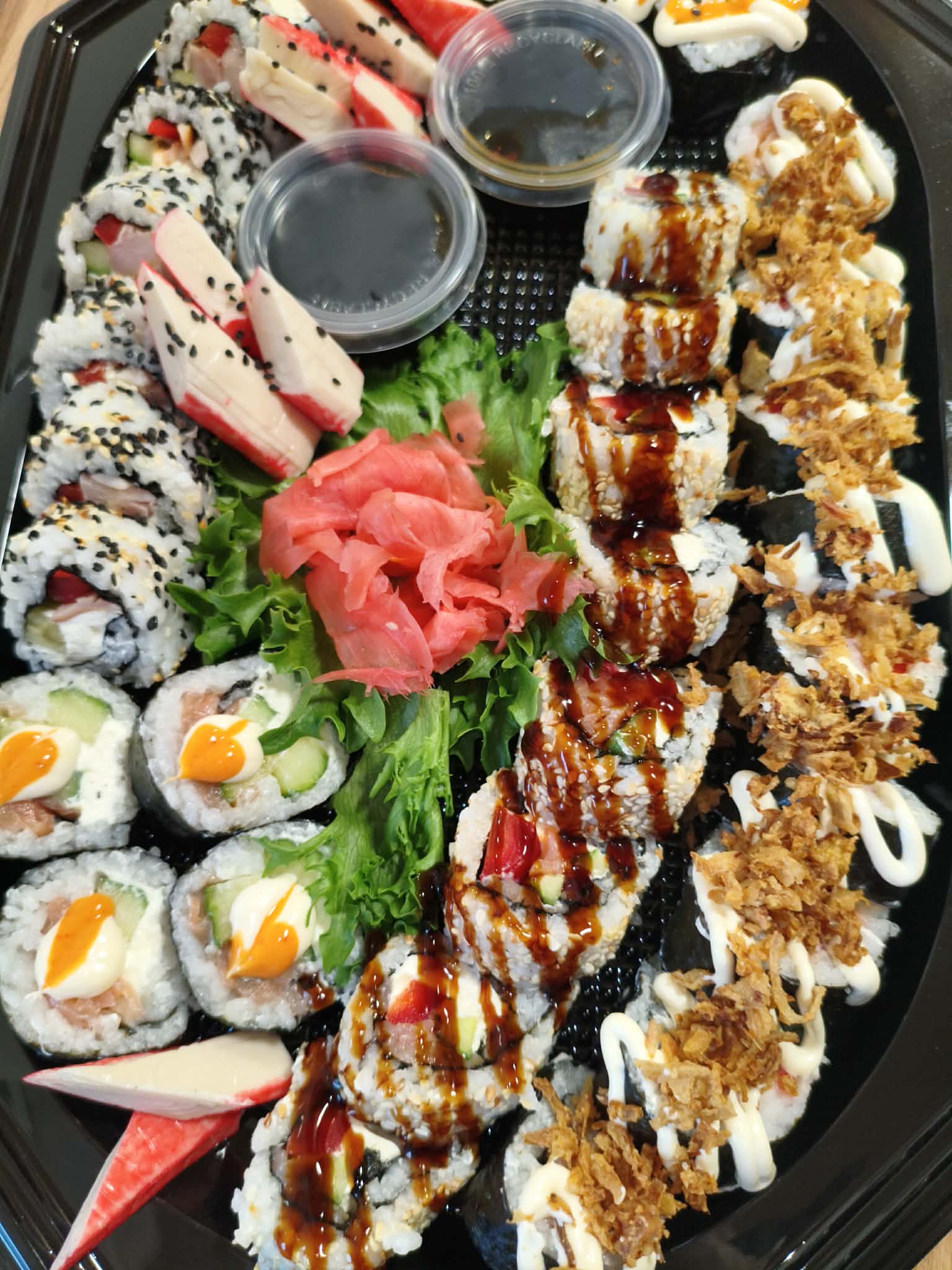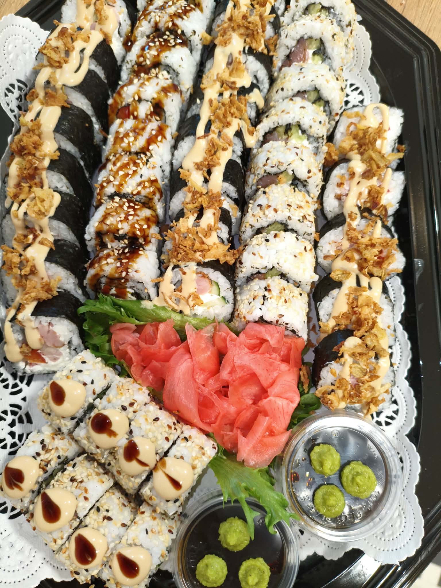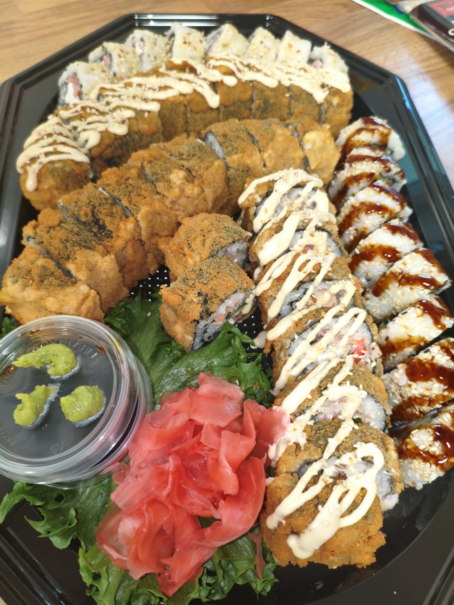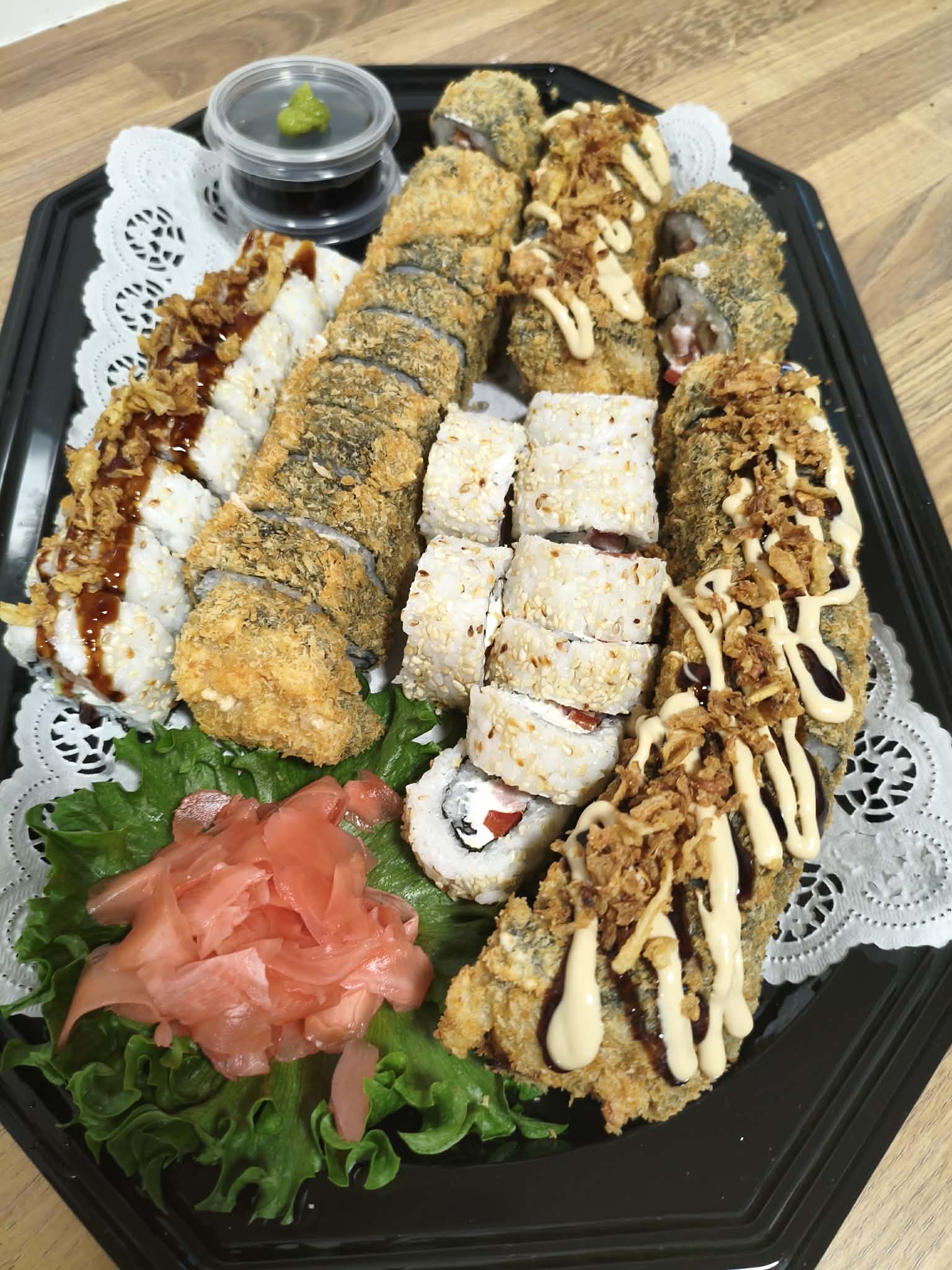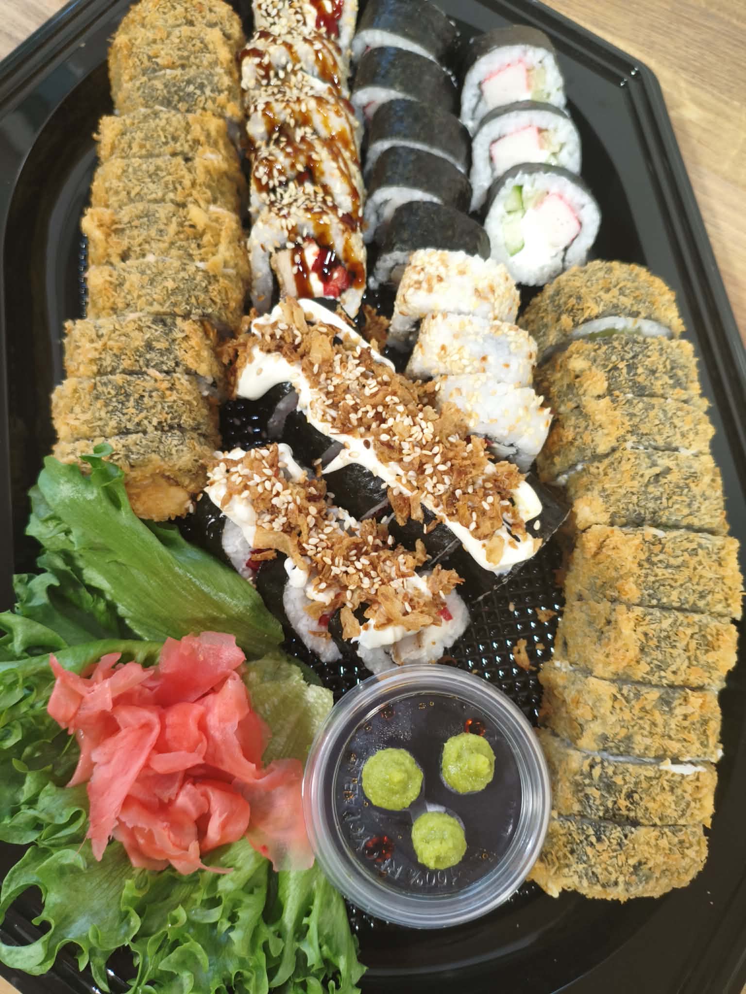 Koostis: Premium sushiriis, nori leht, täidis (kala/mereannid/kana), köögiviljad, toorjuust, tempura-jahu (nisu), panko riivsai, peale niristatud unagi-kaste või vürtsikas majonees.