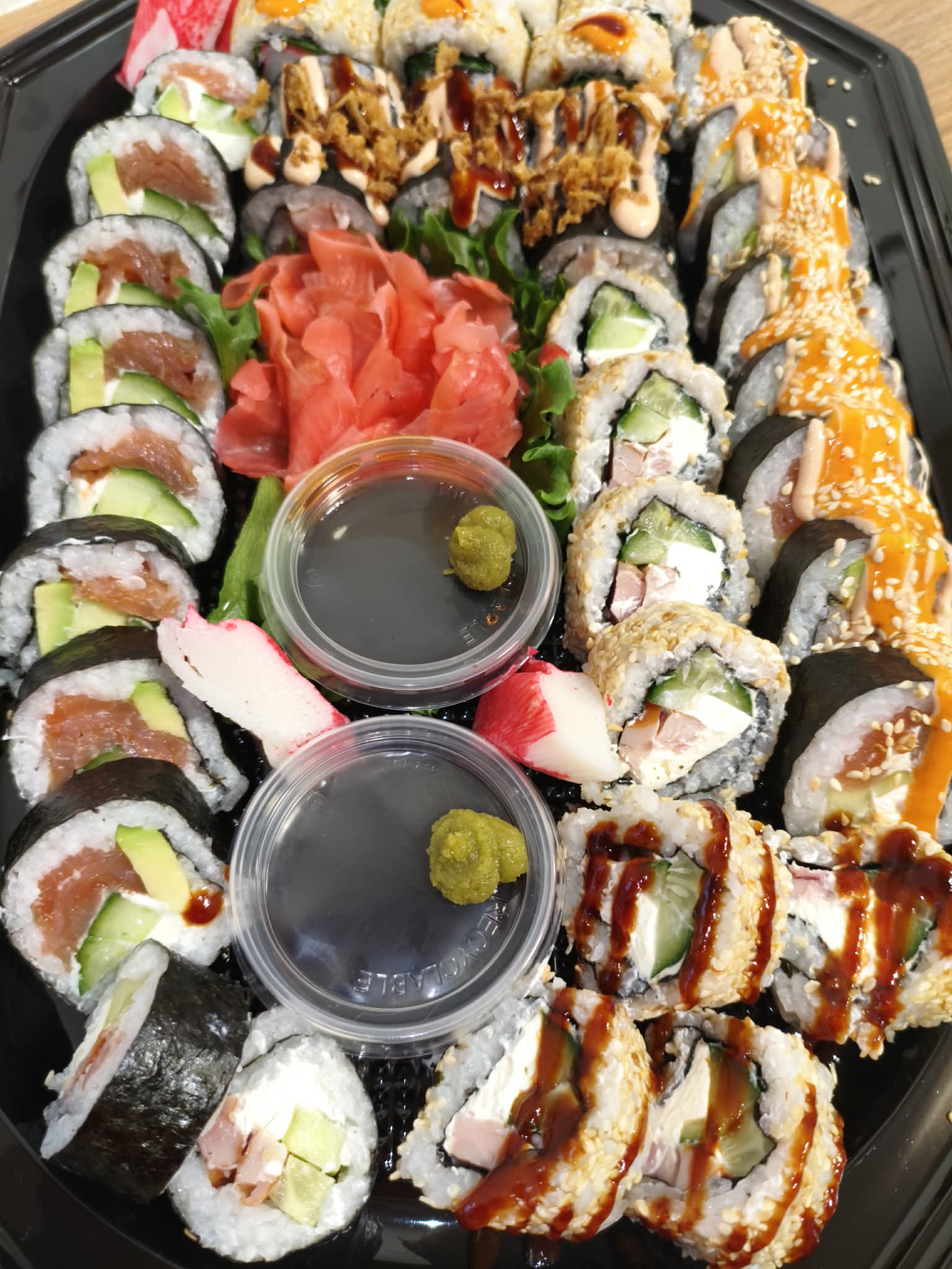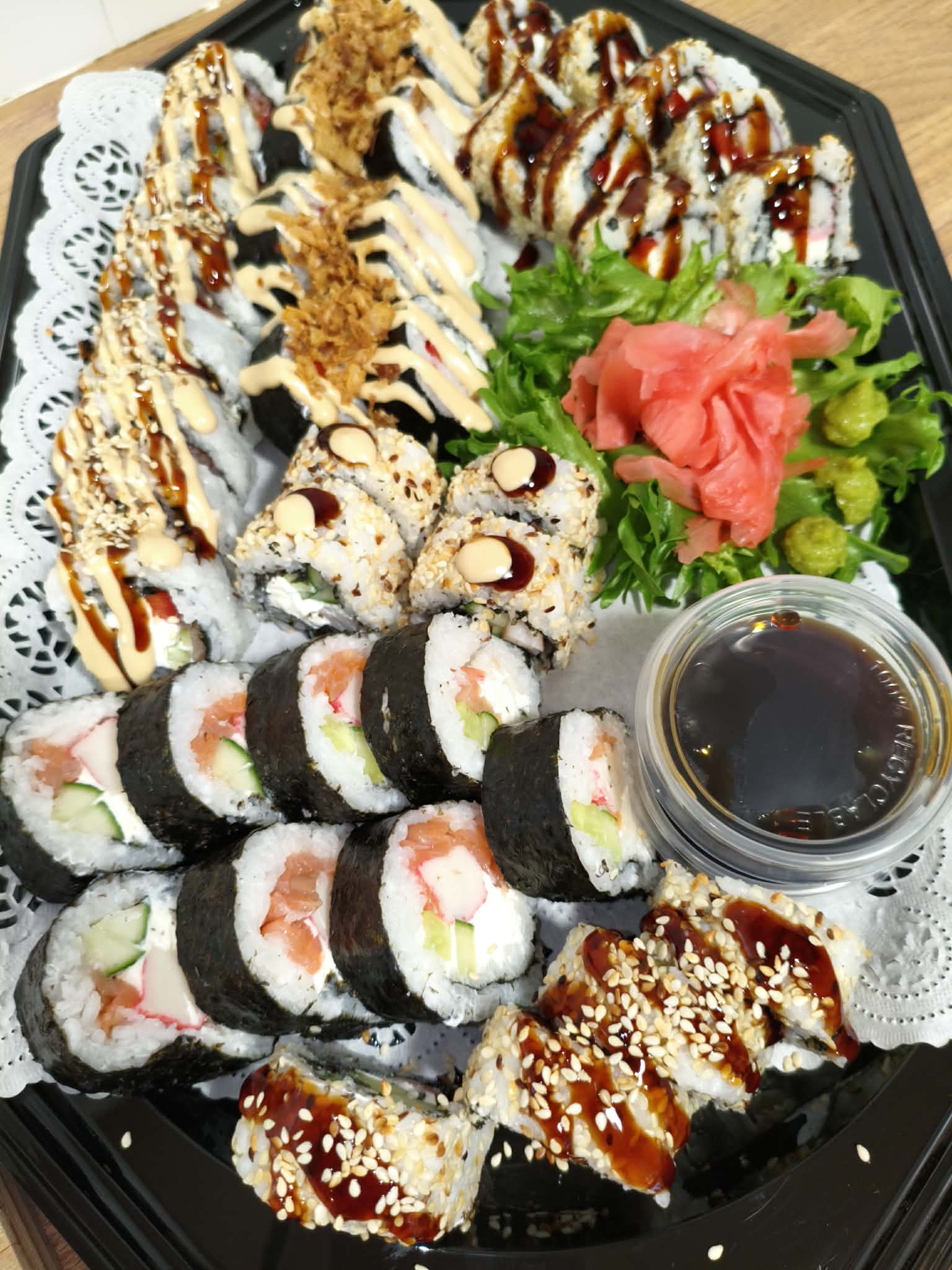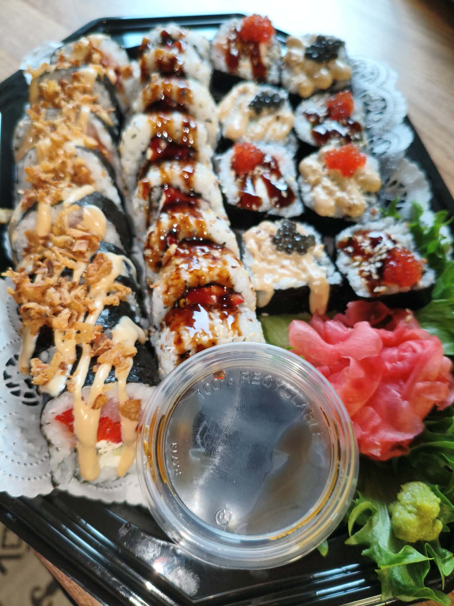Iga portsjoniga on tasuta kaasas: sojakaste, marineeritud ingver, vasabi ja söögipulgad.